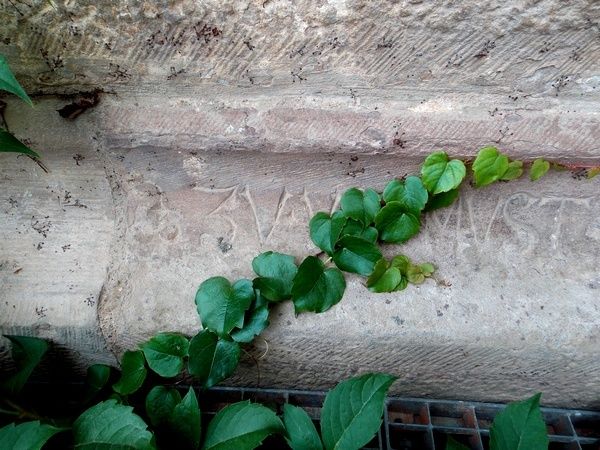 A la base du bâtiment, caché sous une vigne vierge sauvage, sur la doucine, court un texte gravé en écriture gothique. Regardez ! Lisez ! et surtout, souriez ! Il s’agit d’un Trinkspruch ! Les tailleurs de pierre d’antan avaient bien de l’humour !