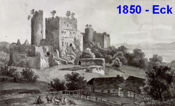- La représentation du logis montre combien cette partie du château a souffert depuis 1830. Plusieurs mètres de muraille se sont effondrés, le conduit de cheminée, bien visible sur le dessin, est aujourd’hui réduit à quelques pierres.